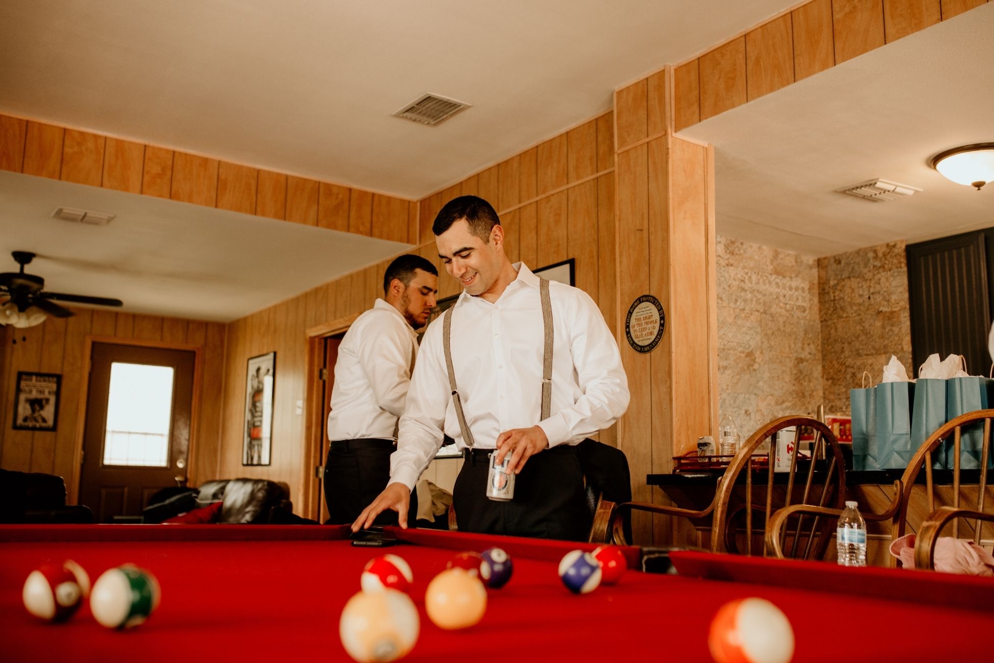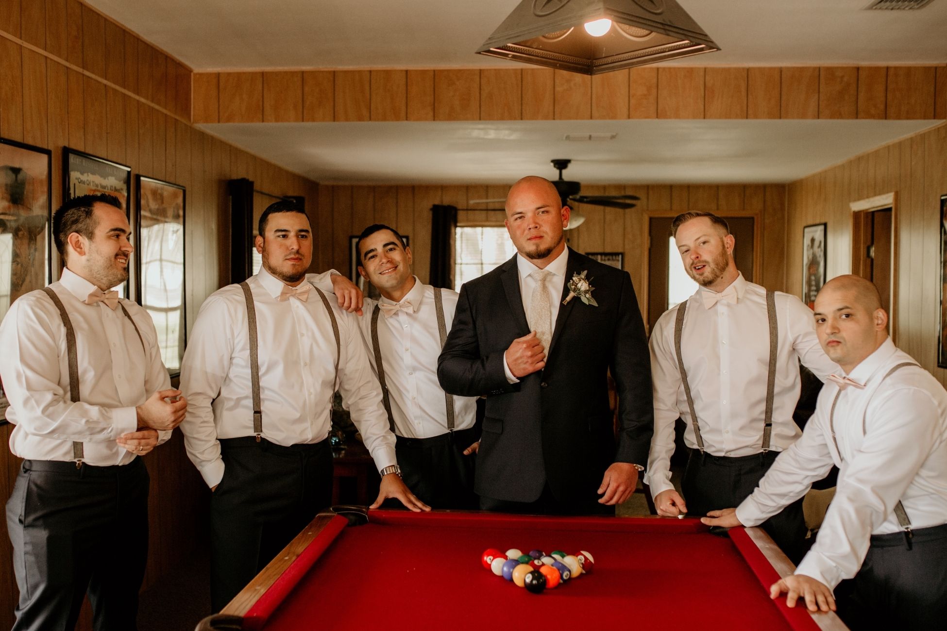 The Groomsmen Cabin provides a fun, relaxing space for the groom and his party. It features a pool table, poker table, TV, and comfortable seating—perfect for unwinding and enjoying time together before the ceremony.